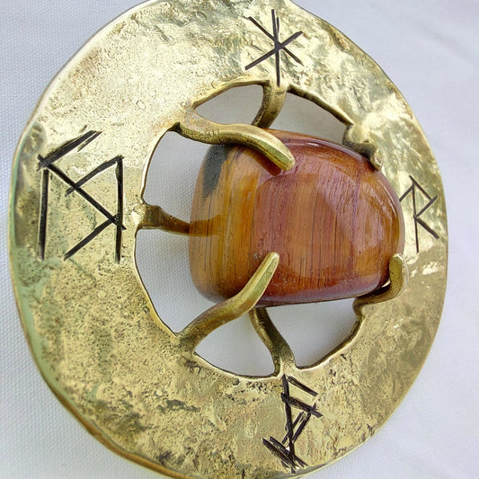 Talismano Runico Occhio di Tigre con Rune Legate Ciondolo in Ottone