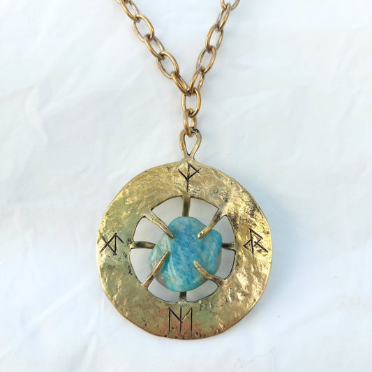 Talismano Runico Amazzonite con Rune Legate Ciondolo in Ottone