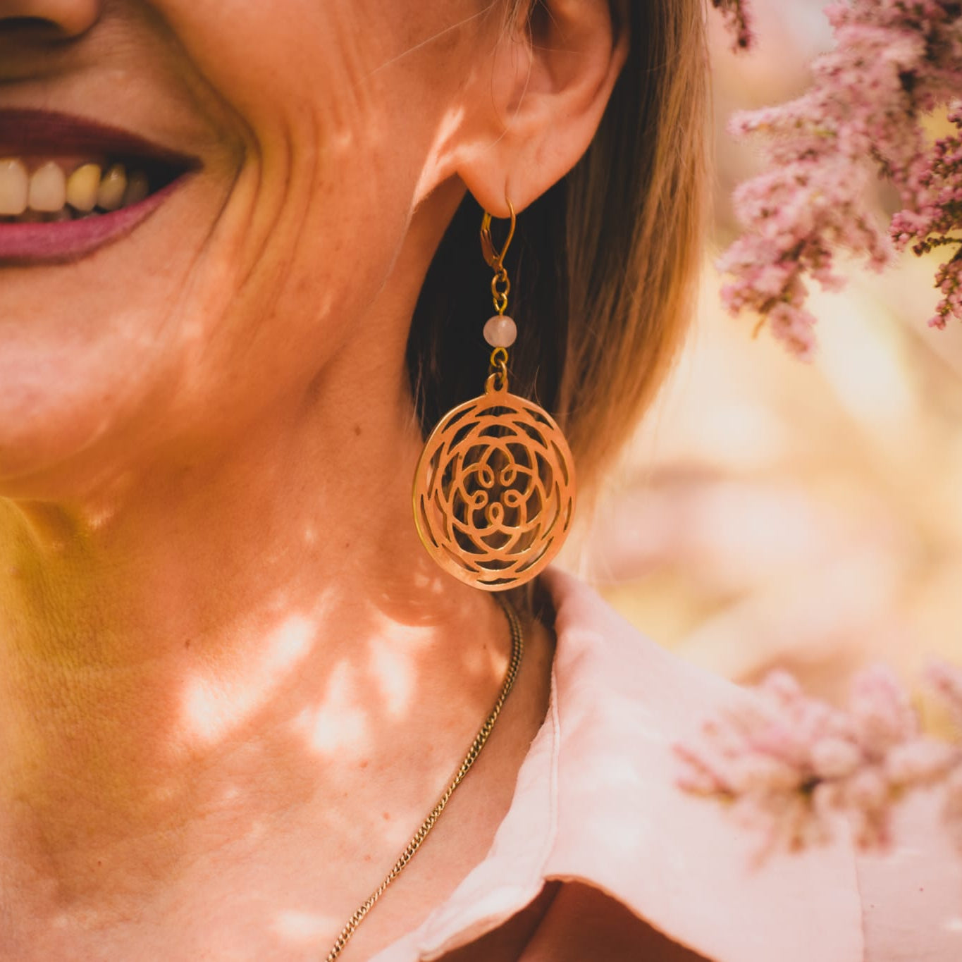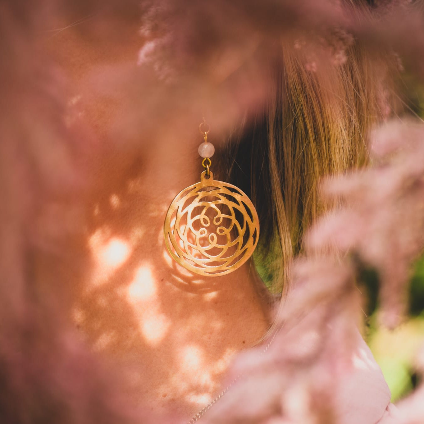 Orecchini Danza di Venere Afrodite in Ottone con Quarzo rosa, creati a cera persa da modello originale traforato a mano.