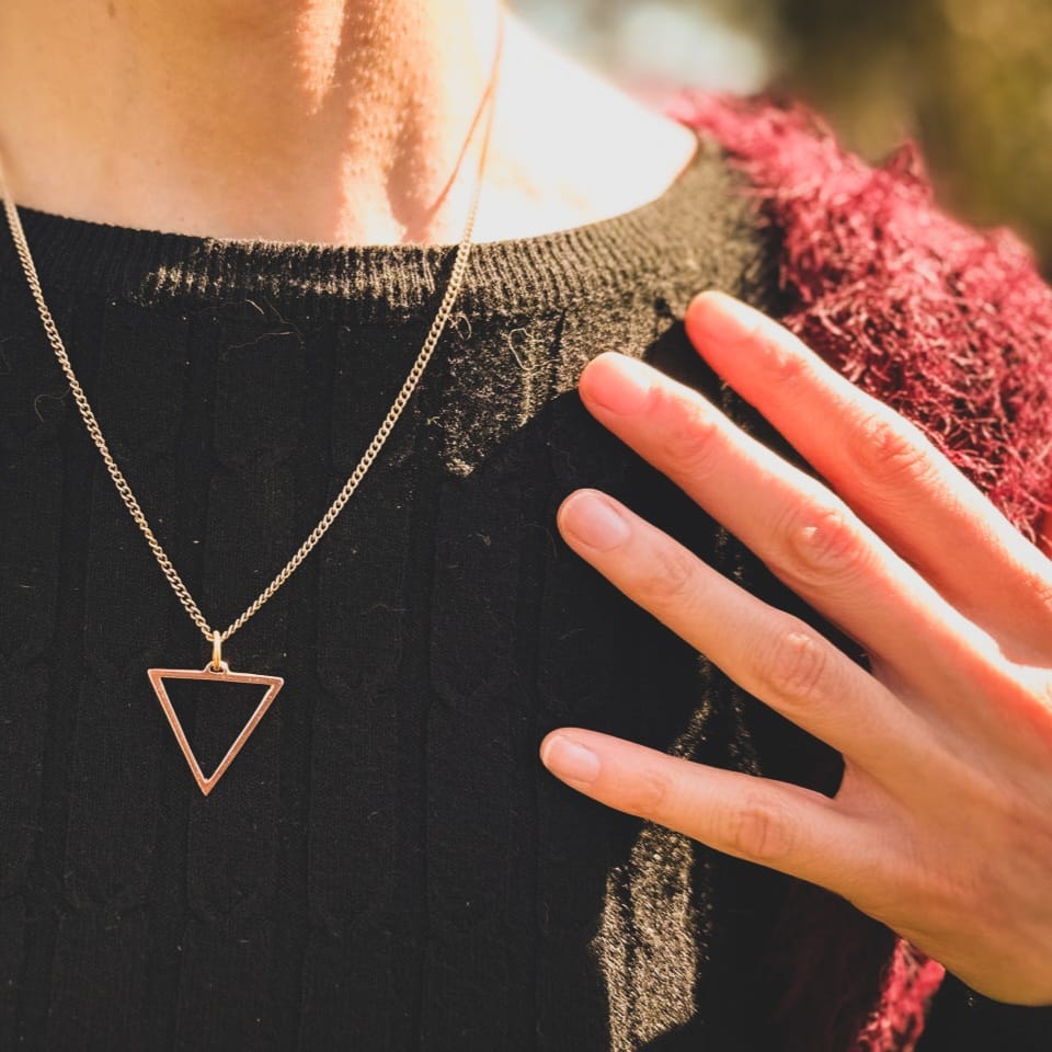 Ciondolo Triangolo Kali in ottone con catenella in ottone, creati a cera persa da modello originale traforato a mano.