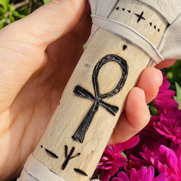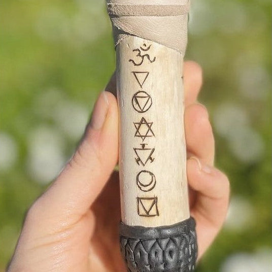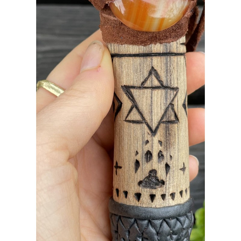 In questo modello diamo la possibilità di scegliere i simboli da pirografare sul manico per connettere il talismano al suo proprietario.
