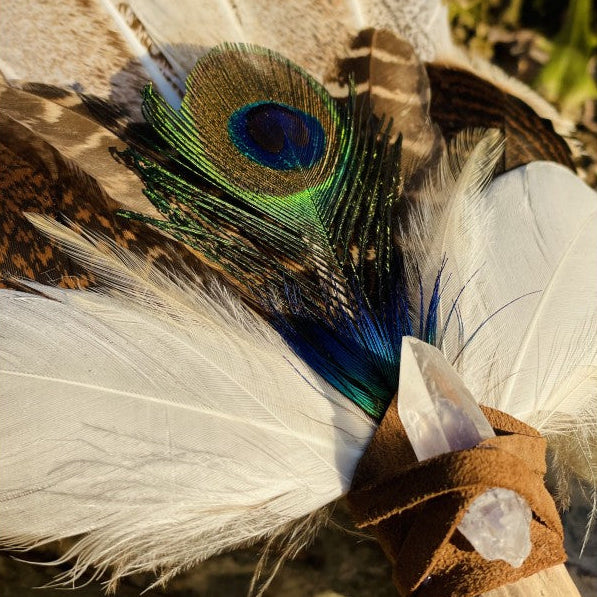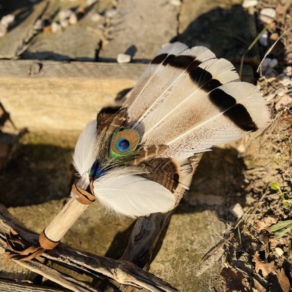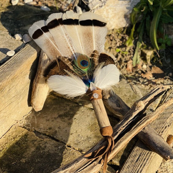 Ventaglio sciamanico con piume e manico personalizzabile.